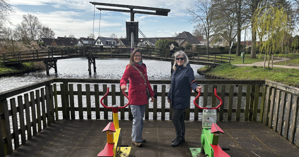 ONDERSCHRIFT: Jessica Doorn (links) en Elsie Hijstek (rechts) op de vlonder waaronder de warmtewisselaar ligt die het hoofdgebouw van de kinderboerderij verwarmt.